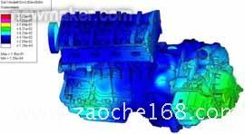 在發(fā)動(dòng)機(jī)設(shè)計(jì)階段中,一般都在線性范圍內(nèi),對(duì)發(fā)動(dòng)機(jī)附件結(jié)構(gòu)進(jìn)行強(qiáng)度和模態(tài)分析。在強(qiáng)度分析中,根據(jù)設(shè)計(jì)部門(mén)提供的設(shè)計(jì)載荷或?qū)嶋H工作載荷,應(yīng)用n 軟件對(duì)結(jié)構(gòu)進(jìn)行有限元計(jì)算,得到零部件在不同工況下的變形、應(yīng)力分布、支反力等等。強(qiáng)度分析的準(zhǔn)確度主要取決于:(1)有限元網(wǎng)格的質(zhì)量,因?yàn)榛兊木W(wǎng)格會(huì)引起虛假的高應(yīng)力,從而影響對(duì)結(jié)果的判定;(2)載荷的確定,附件的外載荷必須由設(shè)計(jì)部門(mén)提供或由發(fā)動(dòng)機(jī)實(shí)際工況計(jì)算得到。而模態(tài)分析則是為了防止附件的固有頻率被發(fā)動(dòng)機(jī)正常工作狀態(tài)的激振所激發(fā),從而那導(dǎo)致危險(xiǎn)的共振破壞。模態(tài)分析的難點(diǎn)主要在于:(1)激振頻率的確定,對(duì)一般直列四缸發(fā)動(dòng)來(lái)說(shuō),主要考慮其二階激振或四階激振;(2)邊界條件的準(zhǔn)確簡(jiǎn)化,由于不同的邊界條件會(huì)使得計(jì)算的固有頻率有所差異,所以必須對(duì)與它們連接的部件進(jìn)行準(zhǔn)確地簡(jiǎn)化和模擬,比如連接螺栓的模擬等。