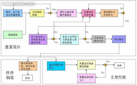 動(dòng)力總成懸置系統(tǒng)的分析方法如圖16 所示。在本方法中,首先根據(jù)整車和動(dòng)力總成的數(shù)據(jù),用 進(jìn)行建模,其中最關(guān)鍵的部分在于懸置元件的描述,由于懸置件大多是橡膠或者液壓的,所以可采用ADAMS 軟件中的Maxwell 模型或者零極點(diǎn)方式來(lái)進(jìn)行描述。在根據(jù)慣性主軸確定了懸置布置方式后,通過(guò)剛體模態(tài)和動(dòng)力總成及懸置件位移之間的平衡來(lái)確定懸置的靜動(dòng)剛度、阻尼以及懸置點(diǎn)在各種工況下的受力,以這些輸出結(jié)果作為懸置件制造和發(fā)動(dòng)機(jī)支架驗(yàn)證的輸入條件。
