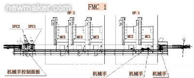 每個FMC中都由幾道工序組成,每道工序分別由多臺相同型號的加工中心組成。每個FMC前面是上料輥道,后面是下料輥道及檢測站。各個FMC之間也是相應(yīng)的輥道,可以起到工件暫存作用。