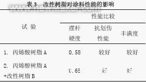 當(dāng)在丙烯酸樹脂中加入樹脂改性后,涂膜的擺桿硬度、抗劃傷性能和豐滿度均有所提高。主要是由于樹脂是一種高固含 (80 % ) 、高羥基含量( 4.5 % ) 的聚酯樹脂,它的加入大大提高了涂膜的豐滿度。