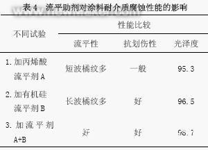 流平助劑一般是通過與涂料體系的一種可控制的不相容來降低涂料體系的表面張力,促使漆膜流平,消除漆膜的表面缺陷。不同類型的流平助劑對漆膜的性能影響結(jié)果如表4所示。