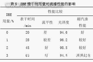 DBE ( Mixed Aliphatic Dibasic Esters )是一種由己二酸二甲酯、戊二酸二甲酯、丁二酸二甲酯組成的酯類溶劑混合物,它具有沸點高、餾程長的特點,可改善漆膜的流平性。由于夏季氣溫高,在進行清漆涂裝作業(yè)時,清漆漆膜中的有機溶劑的揮發(fā)速度大大加快,使漆膜的表干時間縮短,流平性能變差,導(dǎo)致漆膜表面產(chǎn)生許多表面缺陷,如橘皮、針孔等。所以夏季氣溫高時要求清漆中的有機溶劑的揮發(fā)速度要慢一些,以減少漆膜的表面缺陷。一般可通過在涂料中添加一定量的高沸點溶劑( DBE 溶劑)來減慢涂料溶劑的揮發(fā)速度,以避免漆膜出現(xiàn)的表面缺陷。表5 為在30℃的環(huán)境溫度下,不同DBE 慢干劑用量對涂料性能的影響。