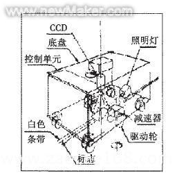 采用圖像識別技術(shù)有2種方法,其一就是利用CCD系統(tǒng)動態(tài)攝取運動路徑周圍環(huán)境圖像信息,并與擬運行路徑周圍環(huán)境圖像數(shù)據(jù)庫的信息進(jìn)行比較,從而確定當(dāng)前位置及對繼續(xù)運行路線做出決策。這種方法不要求設(shè)置任何物理路徑,因此,理論上具有最佳的引導(dǎo)柔性。但這種方法在實際應(yīng)用上還存在某些問題,主要是實時性差和運行路徑周圍環(huán)境信息庫的建立困難。其二就是標(biāo)識線圖像識別方法,它是在AGV運行所經(jīng)過的地面上畫出1條標(biāo)識明顯的引導(dǎo)標(biāo)線,利用CCD系統(tǒng)動態(tài)攝取標(biāo)線圖像并識別出AGV相對于標(biāo)線的方法和距離偏差,以控制車輛沿著設(shè)定的標(biāo)線運行,如圖1所示。