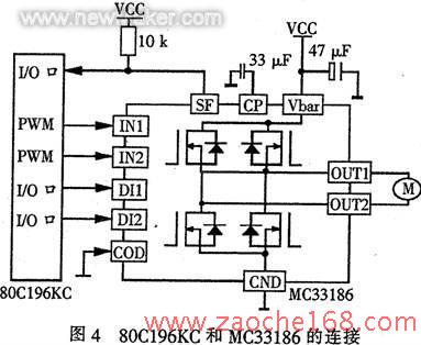本系統(tǒng)的處理器采用的是16位的80C196KC單片機(jī)。節(jié)氣門電機(jī)的驅(qū)動(dòng)芯片采用的是摩托羅拉公司的汽車專用驅(qū)動(dòng)芯片MC33186,其負(fù)載電流為5A,可以滿足節(jié)氣門電機(jī)電流驅(qū)動(dòng)要求。