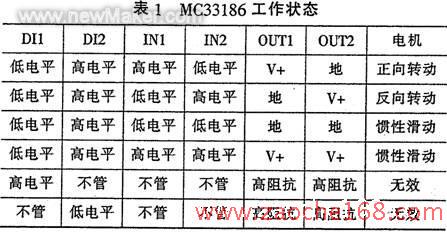 MC33186的INl和IN2既控制電機(jī)的轉(zhuǎn)速又控制電機(jī)的方向。如果想要電機(jī)正向旋轉(zhuǎn).就向 INl施加一個(gè)PWM信號(hào),而將IN2置為低電平。如果想使其反向旋轉(zhuǎn),就將INl置為低電平.而向 IN2施加一個(gè)PWM信號(hào)。PWM信號(hào)的占空比決定了電機(jī)的速度,實(shí)現(xiàn)起來(lái)很方便。把D11置為低電平,把D12置為高電平,電機(jī)正常工作:把D11置高或者把D12置低都可以使電機(jī)停止轉(zhuǎn)動(dòng).也就是使電機(jī)剎車。表l給出了INl、IN2、D11和D12是如何影響電機(jī)工作的。