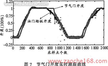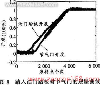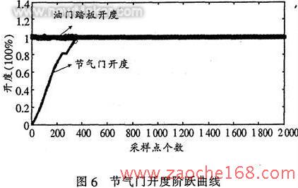 把試驗(yàn)中實(shí)時(shí)記錄的油門踏板開(kāi)度和節(jié)氣門開(kāi)度的數(shù)據(jù).利用MATLAB編程得到一組圖形,其中橫坐標(biāo)為記錄的數(shù)據(jù)個(gè)數(shù),即采樣點(diǎn)的個(gè)數(shù),與時(shí)間成正比.縱坐標(biāo)為開(kāi)度值。圖6為節(jié)氣門的階躍曲線.即油門踏板開(kāi)度在100%的情況下。節(jié)氣門開(kāi)度的變化情況。圖7為節(jié)氣門實(shí)時(shí)跟蹤油門踏板的曲線。