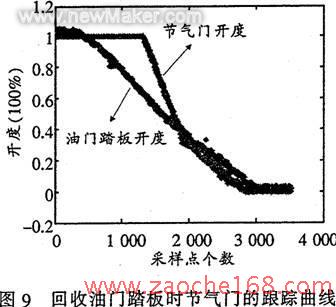 圖8、圖9分別為踏入油門踏板和回收油門踏板時(shí)節(jié)氣門的跟蹤曲線。從圖8看出踏入油門的跟蹤過(guò)程中.同一時(shí)刻節(jié)氣門開(kāi)度值比油門踏板開(kāi)度值小一些、節(jié)氣門要滯后油門踏板一些,屬于正常跟蹤。從圖9看出回收油門的跟蹤過(guò)程中,當(dāng)油門踏板開(kāi)度較大時(shí)節(jié)氣門開(kāi)度值比油門踏板開(kāi)度值大,節(jié)氣門要滯后油門踏板,是在允許的滯后,范圍內(nèi),屬于正常跟蹤。從臺(tái)架的節(jié)氣門的動(dòng)作效果來(lái)看,跟蹤效果很理想。