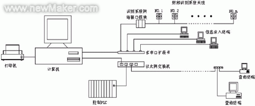 整體系統(tǒng)由計(jì)算機(jī)、RFID、信息錄入終端、信息查詢終端以及控制PLC等組成。系統(tǒng)簡(jiǎn)要結(jié)構(gòu)見(jiàn)圖1。