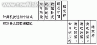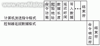 EMS產(chǎn)品提供標(biāo)準(zhǔn)的通訊協(xié)議,使用者可以方便的編寫(xiě)計(jì)算機(jī)和RFID控制器之間的通訊程序。圖2是計(jì)算機(jī)通過(guò)控制器從載碼體中讀取一個(gè)數(shù)據(jù)塊的命令格式以及控制器返回?cái)?shù)據(jù)的格式。在實(shí)際使用中,很多情況下不必讀取標(biāo)簽中的全部數(shù)據(jù),可根據(jù)需要,相關(guān)工位只讀取相關(guān)的一部分信息。這樣能有效的縮短了讀寫(xiě)字節(jié)的長(zhǎng)度。相應(yīng)地減少讀寫(xiě)時(shí)間。