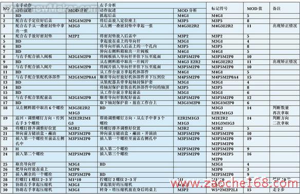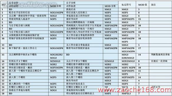 本文是在假定流水線的各工位作業(yè)已經(jīng)確定的情況下,對(duì)其進(jìn)行時(shí)間分析,找到瓶頸工序,然后利用MOD法進(jìn)行動(dòng)作改進(jìn),提高生產(chǎn)率,達(dá)到平衡流水線的目的。