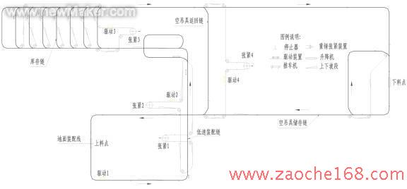 發(fā)動(dòng)機(jī)輸送推桿鏈將發(fā)動(dòng)機(jī)附件低速裝配鏈組合其中,裝配部分的速度可以調(diào)節(jié),以適應(yīng)不同批量(或產(chǎn)量)的生產(chǎn)節(jié)拍安排;發(fā)動(dòng)機(jī)整機(jī)輸送推桿鏈中設(shè)有中間儲(chǔ)存庫(kù),可以根據(jù)整車裝配線的需求,選擇需要的發(fā)動(dòng)機(jī)輸送到整車裝配線,以滿足整車同步裝配的需要。