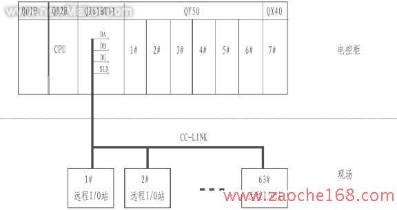 控制系統(tǒng)主要采用了三菱CC-Link總線模塊QJ61BT11,CPU為Q02H。主基板上安裝有1塊QX40輸入模塊,7塊QY50晶體管輸出模塊,主要用來(lái)控制上、下料點(diǎn)升降段的2臺(tái)FR-A540-5.5CH變頻器及慢速裝配鏈的1臺(tái)FR-A540-3.7CH變頻器。安裝于推桿鏈鋼結(jié)構(gòu)軌道沿線的CC-Link遠(yuǎn)程I/O站共有63個(gè),30塊AJ65SBTB1-8D,12塊AJ65SBTB1-16D,4塊AJ65SBTB1-32D,6塊AJ65BTB2-16,10塊AJ65SBTB1-8T,1塊AJ65SBTB1-16T。CC-LINK遠(yuǎn)程I/O站安裝于現(xiàn)場(chǎng)控制箱或按鈕站內(nèi)??刂葡到y(tǒng)的硬件配置圖見(jiàn)圖2。