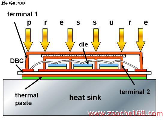 SKiiP模塊中,使用機(jī)械壓接系統(tǒng)將帶有硅片的基板壓置在散熱器上。由于基板不是固定在散熱器上,能夠隨著溫度的變化而伸縮,不會(huì)產(chǎn)生可怕的機(jī)械應(yīng)力。焊接上的芯片的連接非常的小,且對(duì)于硅片來說,基板的熱膨脹系數(shù)是最合適的。因此基于這種技術(shù)的模塊比常規(guī)有底板模塊具有高得多的熱循環(huán)能力。