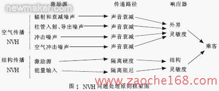 將兩者結(jié)合起來就可以得到基本的NVH 問題處理原則: 利用降低激勵源的激勵, 優(yōu)化空氣傳播和結(jié)構(gòu)傳播途徑, 并且改善響應(yīng)器的接收特性; 在激勵源、傳遞路徑和響應(yīng)器三者之間尋求性能和成本的平衡點。具體框圖如圖1。