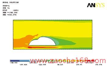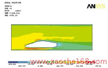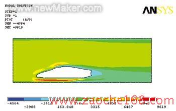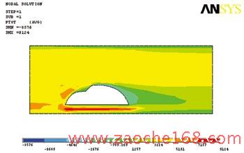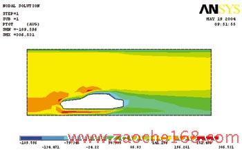由于本文所使用的是ANSYS教學(xué)版軟件,在計算規(guī)模上有很大限制,因此對計算模型進行了必要的簡化,考慮汽車結(jié)構(gòu)的對稱性,在忽略側(cè)風(fēng)等非對稱性因素的影響,考慮汽車的對稱面,同時對車底、車頭等部位均進行了必要的簡化,建立了平面有限元模型。使用ANSYS軟件的2D FLOUNT 141單元進行離散,用有限元的二維分析模型進行求解。