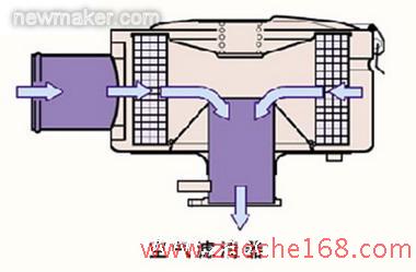 在現(xiàn)代轎車上,為了增強(qiáng)發(fā)動(dòng)機(jī)的諧振進(jìn)氣效果,空氣濾清器進(jìn)氣導(dǎo)流管需要有較大的容積。但是導(dǎo)流管不能太粗,以保證空氣在導(dǎo)流管內(nèi)有一定的流速,因此,進(jìn)氣導(dǎo)流管只能做得很長(zhǎng)。較長(zhǎng)的進(jìn)氣導(dǎo)流管有利于實(shí)現(xiàn)從車外吸氣。因?yàn)檐囃饪諝鉁囟纫话惚劝l(fā)動(dòng)機(jī)罩下的溫度低30℃左右,所以從車外吸入的空氣密度可增大近10%,燃油消耗率可降低3%。