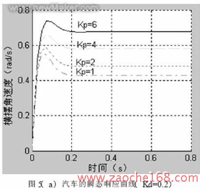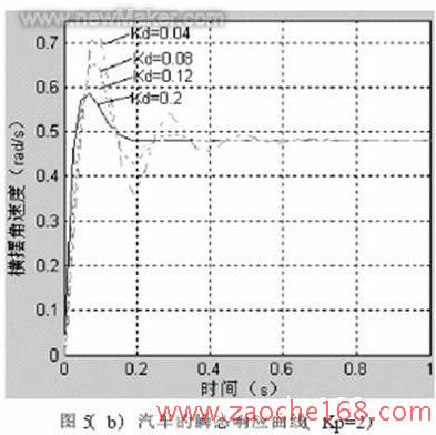 由圖5(a)可以看出,當(dāng)比例控制系數(shù)Kp減小時(shí)能很好的抑制系統(tǒng)的超調(diào)量;但是對(duì)系統(tǒng)的反應(yīng)時(shí)間和穩(wěn)定時(shí)間幾乎沒(méi)有任何影響;由圖5(b)可以看出,Kd取較大值時(shí),系統(tǒng)的超調(diào)量得到明顯的抑制,且系統(tǒng)的反應(yīng)時(shí)間和穩(wěn)定時(shí)間均十分理想;但是隨著Kd的減小,系統(tǒng)的反應(yīng)時(shí)間增大,系統(tǒng)的阻尼系數(shù)逐漸變小,超調(diào)量增大,汽車的操縱穩(wěn)定性明顯的變壞。