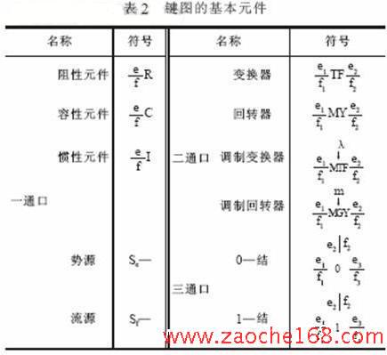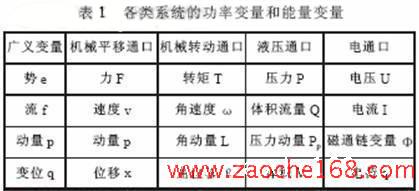 在每個(gè)系統(tǒng)中,相互作用的子系統(tǒng)之間有功率的傳遞,鍵合圖以此為依據(jù)建立系統(tǒng)模型,系統(tǒng)間傳遞功率的地方即為通口;鍵合圖中有4種狀態(tài)變量為勢(shì)e(t)、流f(t)、動(dòng)量p(t)和變位q(t),通常我們把動(dòng)量p(t)和變位q(t)稱為能量變量,勢(shì)e(t)和流f(t)稱為功率變量。表1 給出了各種不同能量范疇的功率和能量變量。