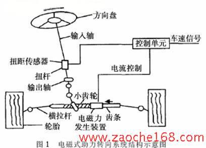 電磁式助力轉(zhuǎn)向系統(tǒng)主要由轉(zhuǎn)矩傳感器、車速傳感器、控制單元、電磁力發(fā)生裝置等組成。在操縱方向盤時(shí),控制單元根據(jù)轉(zhuǎn)矩傳感器輸出的轉(zhuǎn)向轉(zhuǎn)矩信號(hào)及車速傳感器輸出的車速信號(hào)調(diào)節(jié)電磁力發(fā)生裝置供電電流的大小,以獲得適當(dāng)?shù)霓D(zhuǎn)向助力,從而保證車輛在任何工況下轉(zhuǎn)向都有較理想的操縱穩(wěn)定性和轉(zhuǎn)向輕便性,即在原地操舵及低速轉(zhuǎn)向輕便靈敏,在高速下轉(zhuǎn)動(dòng)方向盤不會(huì)喪失路感。