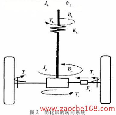 在建模過(guò)程中,我們把汽車簡(jiǎn)化為只具有側(cè)向移動(dòng)和橫擺運(yùn)動(dòng)的線性二自由度的汽車模型;同時(shí)將轉(zhuǎn)向系統(tǒng)的轉(zhuǎn)向機(jī)構(gòu)向轉(zhuǎn)向柱簡(jiǎn)化,把系統(tǒng)中各構(gòu)件繞其中心的轉(zhuǎn)動(dòng)慣量等效為繞轉(zhuǎn)向柱的轉(zhuǎn)動(dòng)慣量,并以等效阻尼系數(shù)代替各連接鉸或運(yùn)動(dòng)副的助力系數(shù)之和,轉(zhuǎn)矩傳感器可以看成是一個(gè)剛度為Ks的扭力桿。簡(jiǎn)化后的轉(zhuǎn)向系統(tǒng)如圖2中所示。
