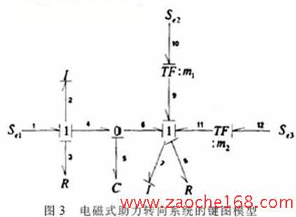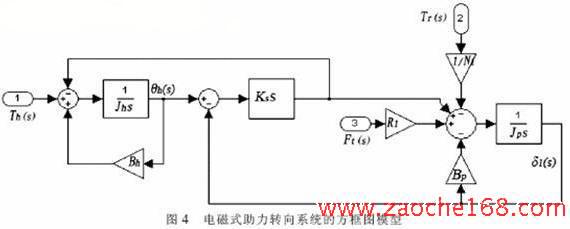 根據(jù)鍵合圖元件與方框圖的的對(duì)應(yīng)關(guān)系,可由系統(tǒng)的鍵圖模型建立出與圖3相對(duì)應(yīng)的汽車電磁式助力轉(zhuǎn)向系統(tǒng)的方框圖模型如圖4。