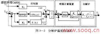 當(dāng)|e(k)|>3%并持續(xù)時(shí)間t>t1后,F(xiàn)(t1,t2)置位為1;t>t2后,F(xiàn)(t1,t2)復(fù)位為0。取F(t1,t2)的上升沿作為標(biāo)志F1(t1)=δ(t1)。在F(t1,t2)為0時(shí),自學(xué)習(xí)PID控制器起作用。Δu1(k)累加到綜合控制器輸出;在F(t1,t2)為1時(shí),自學(xué)習(xí)PID控制器不起作用,Δu1(k)=0。F1(t1)為脈沖,每個(gè)脈沖Δu2(k)累加到綜合控制器輸出一次。噴煤計(jì)量裝置和分解爐一起作為綜合控制器的控制對(duì)象。因前饋控制對(duì)分解爐爐中溫度變化具有抑制作用,故Δu3(k)無(wú)論F(t1,t2)和F1(t1)的狀態(tài)如何,都累加到綜合控制器輸出。綜合控制器框圖見(jiàn)圖3—2,其中噴煤計(jì)量裝置為成套設(shè)備,其執(zhí)行機(jī)構(gòu)為一階慣性環(huán)節(jié),帶有常規(guī)PID控制器。用Control Build編程實(shí)現(xiàn)上述算法,利用CM模塊形成采樣周期和大誤差標(biāo)志等,利用SCM模塊進(jìn)行算法運(yùn)算。