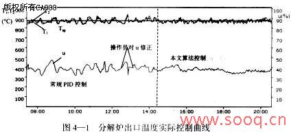 在某水泥廠分解爐出口溫度控制回路中的實(shí)際運(yùn)行結(jié)果表明,采用常規(guī)PID控制,溫度波動(dòng)±50℃;采用本文方案,溫度波動(dòng)不超過(guò)±30℃。如圖4—1所示,設(shè)定值Tsp=870℃,T1為分解爐出口溫度實(shí)測(cè)值,T2為爐中溫度,u為控制量。與利用API函數(shù)編制用戶算法在主服務(wù)器上運(yùn)行相比,該方案克服了采樣和控制周期受計(jì)算機(jī)負(fù)荷影響而變化的缺陷,而且不受通訊影響,工作穩(wěn)定可靠,安全性好。綜合控制器手動(dòng)/自動(dòng)切換時(shí)無(wú)擾動(dòng)。