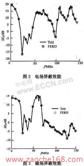 使用EMC studio中TriD(矩量法)和FEKO軟件計(jì)算外場屏蔽效能(θ=80°,η=90°,φ=45°),如圖2、3所示。