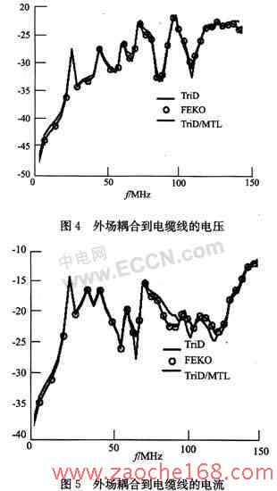 用不同算法計(jì)算入射場耦合到電纜線中的電壓和電流(TriD-矩量法,FEKO-矩量法,TriD/MTL矩量法和傳輸線法的混合算法),如圖4、5所示。
