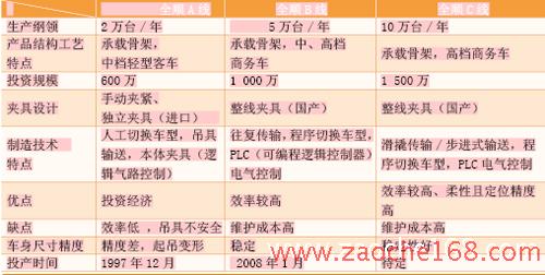 對于焊裝線結(jié)構(gòu)形式的選擇,最需要考慮的是生產(chǎn)綱領(lǐng)、產(chǎn)品結(jié)構(gòu)和工藝特點、投資規(guī)模和夾具設(shè)計制造技術(shù)水平以及廠房等情況,在細部結(jié)構(gòu)上要結(jié)合產(chǎn)品的壽命周期、市場定位和質(zhì)量要求,并對相關(guān)因素進行綜合比較來進行選擇。全順廠焊裝車間有全順A線、全順B線,未來要規(guī)劃全順C線,我們將這三條線做個比較(如表)。