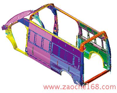 全順白車身結(jié)構(gòu)類似于轎車,一般由外覆蓋件、內(nèi)覆蓋件和承載的骨架組成,像側(cè)圍外板、側(cè)圍內(nèi)板、門蓋內(nèi)外板和頂蓋這樣的內(nèi)、外覆蓋件的鋼板厚度一般為0.81.2mm,骨架件的鋼板厚度多為1.22.5mm。在本體夾具前預(yù)裝時,焊好的側(cè)圍總成、骨架總成都具有較大的剛性,而且相對的搭接面很復(fù)雜,在本體夾具側(cè)圍定位模塊定位側(cè)圍過程中,常常會因為側(cè)圍總成與骨架總成貼合面干涉,側(cè)圍定位模塊無法運動到位,因而在偏差狀態(tài)下焊接造成整車尺寸的偏差。