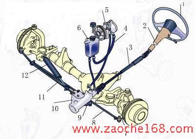 1.方向盤(pán) 2.轉(zhuǎn)向軸 3.轉(zhuǎn)向中間軸 4.轉(zhuǎn)向油管 5.轉(zhuǎn)向油泵 6.轉(zhuǎn)向油罐 7.轉(zhuǎn)向節(jié)臂 8.轉(zhuǎn)向橫拉桿 9.轉(zhuǎn)向搖臂 10.整體式轉(zhuǎn)向器 11.轉(zhuǎn)向直拉桿 12.轉(zhuǎn)向減振器