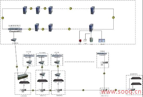 整條高速公路共有隧道18條231個監(jiān)控傳輸點。每條隧道主要負責(zé)PLC照明、PLC風(fēng)控、PLC車道指示、火災(zāi)報警、車檢器、情報板6部分。隧道內(nèi)至隧道口機房采用雙纖環(huán)網(wǎng),隧道口機房至分中心采用FDU設(shè)備、隧道口機房至收費站采用光纖收發(fā)器,收費站至分中心、服務(wù)區(qū)采用FDU設(shè)備或光纖收發(fā)器。主干線網(wǎng)絡(luò)由9臺FDU設(shè)備完成。以上為隧道內(nèi)至隧道口機房采用Omate 6000設(shè)備,將隧道內(nèi)采集以太網(wǎng)數(shù)據(jù)傳輸給光纖收發(fā)器或FDU設(shè)備。其中祝源隧道采用50臺Omate 6000設(shè)備組成環(huán)網(wǎng),集中表現(xiàn)設(shè)備冗余性。