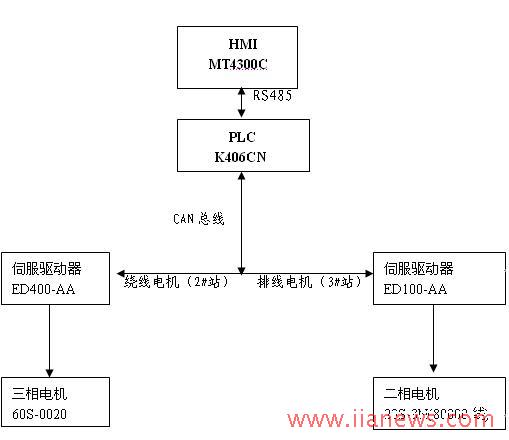 排線電機采用二相伺服 ED100帶CAN總線的驅(qū)動器+23S21-0560-808N7(80000分辨率),HMI采用5.7寸真彩顯示的MT4300C,PLC采用Kinco K406CN,該PLC帶1個CAN通訊接口,還有1個232通訊口和一個485通訊口,功能強大,通訊能力強,另外還采用一個遠程總線I/O模塊,用于連接遠程IO,減少設(shè)備接線復(fù)雜度??梢砸曄到y(tǒng)復(fù)雜度添加更多這樣的模塊。