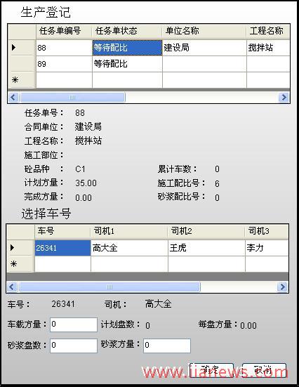 由“易控(INSPEC)”實(shí)現(xiàn)的攪拌站自動化控制系統(tǒng)提供了兩種生產(chǎn)方式,手動生產(chǎn)和自動生產(chǎn)。在自動生產(chǎn)模式下,用戶可以通過生產(chǎn)畫面中的“生產(chǎn)登記”按鈕,選擇已經(jīng)填寫好的生產(chǎn)任務(wù)單(如圖3所示),之后點(diǎn)擊“開始生產(chǎn)”按鈕,系統(tǒng)就會按照任務(wù)單中包含的混凝土的信息自動的進(jìn)行生產(chǎn),整個生產(chǎn)過程不需要用戶手動操作。在手動生產(chǎn)模式下,用戶可以通過點(diǎn)擊畫面中的各個倉門來實(shí)現(xiàn)放料配料的過程,各個倉門之間存在著邏輯互鎖,操作員的所有操作都在畫面的日志記錄區(qū)中顯示,保證了生產(chǎn)過程的安全。