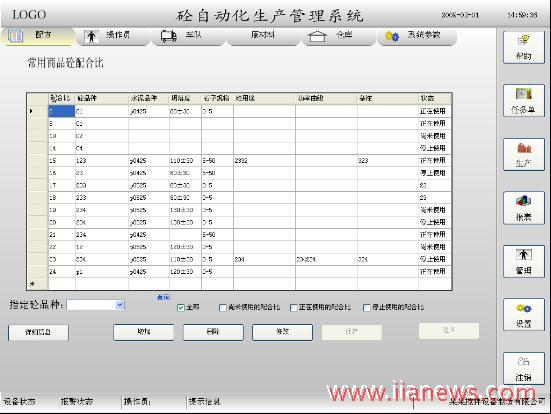 為了滿足產(chǎn)品多樣化的要求,由“易控(INSPEC)”實(shí)現(xiàn)的攪拌站自動化控制系統(tǒng)與外部數(shù)據(jù)庫連接,用數(shù)據(jù)庫來管理不同品種混凝土的配方數(shù)據(jù),不僅可存儲配方的數(shù)量增大很多,還可隨時對配方內(nèi)容進(jìn)行編輯。配方管理功能提供了新增、刪除、修改、查詢等功能。編輯完成的配方保存在與易控相連的數(shù)據(jù)庫中,在填寫生產(chǎn)任務(wù)單時可供操作員選擇。