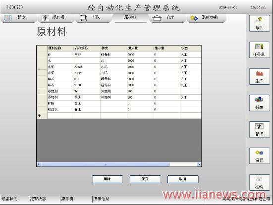 由“易控(INSPEC)”實(shí)現(xiàn)的攪拌站自動化控制系統(tǒng)包含的倉庫管理、原材料管理、車隊(duì)管理、操作員管理及運(yùn)送記錄管理,提供了新增、刪除、修改、查詢等功能,編輯完成的信息存儲在與易控相連的數(shù)據(jù)庫中。