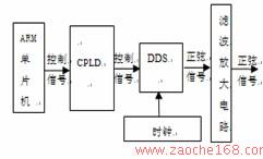 采用DDS技術(shù)在當(dāng)前的測試測量行業(yè)已是一種主流的做法[6],其頻率精度可隨相位累加器的位數(shù)而定。本系統(tǒng)采用單片機(jī)+專用DDS芯片的方式產(chǎn)生正弦信號(hào),其原理如圖4所示,ARM單片機(jī)向CPLD 發(fā)出控制命令,CPLD 在時(shí)鐘下譯碼后產(chǎn)生DDS的控制信號(hào),產(chǎn)生出相應(yīng)頻率的正弦波信號(hào),該正弦信號(hào)經(jīng)過濾波放大后,輸出相應(yīng)幅值的正弦信號(hào)。