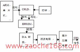 曲軸位置信號(hào)(CPS)是PCM控制點(diǎn)火系統(tǒng)中最主要的傳感器信號(hào),為適應(yīng)多種PCM的需求,設(shè)計(jì)采用CPLD和DA的方式產(chǎn)生。CPS信號(hào)產(chǎn)生原理如圖5所示,在EPROM中存有一個(gè)周期的正弦表數(shù)據(jù),當(dāng)需要產(chǎn)生CPS信號(hào)時(shí),ARM單片機(jī)對CPLD進(jìn)行設(shè)置,CPLD根據(jù)接收的控制命令,通過時(shí)鐘計(jì)數(shù),產(chǎn)生讀存儲(chǔ)器的信號(hào),并向EPROM提供合適的地址信號(hào)和控制信號(hào),EPROM輸出相應(yīng)地址的數(shù)據(jù),經(jīng)D/A轉(zhuǎn)換,變成單端CPS模擬信號(hào),然后經(jīng)濾波電路和單端轉(zhuǎn)差分處理電路,輸出CPS差分信號(hào)。在實(shí)際的電路實(shí)現(xiàn)中,對CPS信號(hào)的控制可由計(jì)算機(jī)通過CAN總線向ARM發(fā)出控制命令進(jìn)行設(shè)置,因此,即使ARM芯片在運(yùn)行過程中復(fù)位,電路仍能輸出正確的CPS信號(hào),以確保測試周期的正常進(jìn)行。