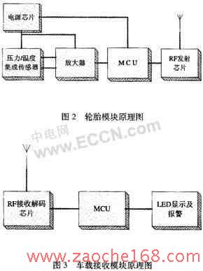 該系統(tǒng)的基本工作原理如下,把輪胎模塊裝置在輪胎內(nèi),壓力和溫度傳感器檢測輪胎內(nèi)部當(dāng)前的應(yīng)力和溫度信息,獲得的模擬信號經(jīng)過A/D變換器轉(zhuǎn)換成數(shù)字信號,然后通過射頻發(fā)射器發(fā)送出去。車載接收模塊裝置在駕駛室內(nèi),射頻接收器接收來自輪胎模塊的應(yīng)力和溫度信息,當(dāng)輪胎壓力過高或者過低時,通過顯示和報警裝置發(fā)出報警信息。