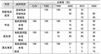 各種環(huán)保型汽車涂料在汽車車身用涂料中占有率及發(fā)展趨勢列于下表