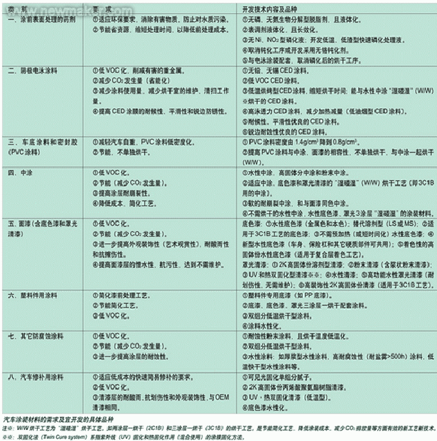 3. 零排放化。現(xiàn)有溶劑系中涂、底色漆和水性中涂、水性底色漆低溶劑(VOC)化、高固體份化;雙組分低溫固化型罩光清漆、高固體份化、水性化;無(wú)VOC的粉末涂料(含漿狀粉末涂料)薄膜化。