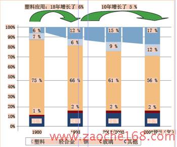 圖三 1980~2008年汽車制造工業(yè)中材料科學的研發(fā)演變:隨著材料科技的進步,塑料材料近幾年的應用得到長足發(fā)展