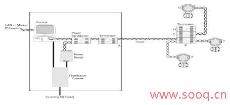 由于雷擊、供電電壓波動(dòng)、靜電放電、電磁場(chǎng)干擾及地電位差別過大等原因引起回路突現(xiàn)過電壓、過電流的現(xiàn)象。直擊雷或感應(yīng)雷帶來的強(qiáng)大電磁場(chǎng)干擾常常是形成強(qiáng)大浪涌的主要原因,其電流波形的上升沿異常陡峭,形成對(duì)儀表的強(qiáng)大沖擊;另外地電勢(shì)的不平衡常常也會(huì)帶來各種形式的反擊電流,這種現(xiàn)象在監(jiān)視控制點(diǎn)比較分散的過程系統(tǒng)中比較常見,如下圖中所示的FF總線系統(tǒng)。