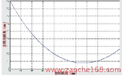 圖3為前輪上下跳動對主銷內(nèi)傾角的影響,在前輪上下跳動50mm的過程中,主銷內(nèi)傾角的最大值為7.9°,最小值為7.08°,整個過程中變化量為0.82°。