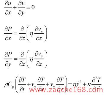 聚合物熔體在模具型腔中的流動是非牛頓不可壓縮流體的具有自由面的非等溫瞬態(tài)Laminar流動。利用廣義的Hele-Shaw流動模型,熔體在型腔內(nèi)流動的控制方程為: