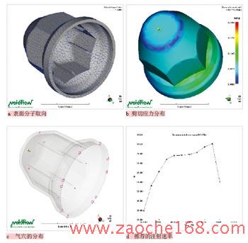 從以上模擬結(jié)果可以直觀地顯示出影響產(chǎn)品質(zhì)量和外觀的諸類因素,如產(chǎn)品的表面分子取向、剪切應(yīng)力和氣穴的位置等。另外,我們都是以穩(wěn)定的注射速率為依據(jù)進行流動模擬的,這就造成熔體前沿部分的流動速度急劇變化。熔體前沿流動速度的變化所造成的分子取向不均勻是制品產(chǎn)生翹曲變形的原因之一。因此,模擬結(jié)果還給出了優(yōu)化以后的注射速率。