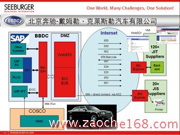 2006年,北京奔馳-戴姆勒-克萊斯勒汽車有限公司(以下簡稱為“BBDC”)以先進(jìn)的現(xiàn)代化汽車生產(chǎn)設(shè)施裝備的新工廠在北京落成。新工廠規(guī)劃生產(chǎn)梅賽德斯-奔馳品牌包括E級和C級系列產(chǎn)品以及克萊斯勒品牌中最具代表性的旗艦車型——克萊斯勒300C。盡管中國的工作人員對企業(yè)資源規(guī)劃(ERP)及電子數(shù)據(jù)交換(EDI)經(jīng)驗(yàn)有限,但BBDC決定在新工廠使用全面的自動(dòng)化流程管理(Back End Processing)來實(shí)施及時(shí)排序生產(chǎn)(Just in Sequence,JIS)。具體方法為,實(shí)施SAP汽車行業(yè)ERP解決方案,部署SEEBURGER的B2B網(wǎng)關(guān)軟件實(shí)現(xiàn)與大型供應(yīng)商直接互接,同時(shí)利用SEEBURGER的WebEDI貿(mào)易伙伴門戶系統(tǒng)整合中小供應(yīng)商及第三方物流(3PL),實(shí)現(xiàn)信息以及AIAG B10智能條形碼整合。這是中國汽車行業(yè)內(nèi)首次利用全球最先進(jìn)的信息系統(tǒng)實(shí)現(xiàn)全面的供應(yīng)鏈架構(gòu)整合。