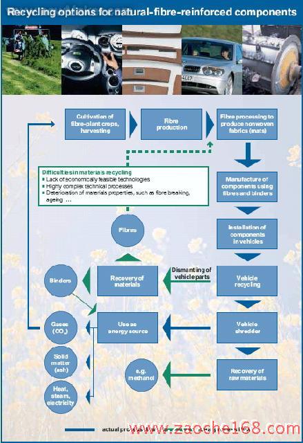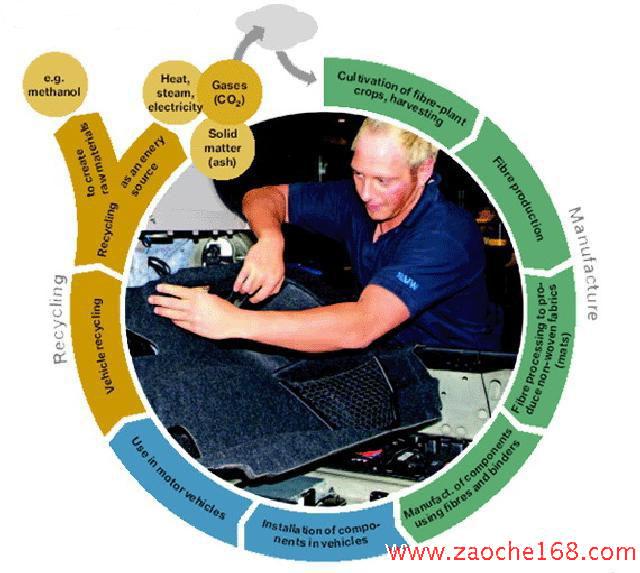 可再生材料經(jīng)常被引入到關(guān)于汽車報(bào)廢回收的討論中,因?yàn)椤翱稍偕蓖ǔ1坏韧凇翱山到狻?。但原則上,可再生材料和汽車回收最大化的努力之間的聯(lián)系是表面的。天然纖維的使用不是代表可回收的理念。從技術(shù)因素來講,對于汽車產(chǎn)品而言事實(shí)上是要防止作物纖維降解(腐蝕)。在任何氣候條件下,在汽車的整個(gè)使用壽命期內(nèi),完全有必要確保全車所有部件的長期穩(wěn)定性。這也就是為什么現(xiàn)在纖維要附上特殊的塑料粘合劑。粘合劑包裹著纖維表面隔離潮氣和微生物,防止天然纖維的腐蝕。
