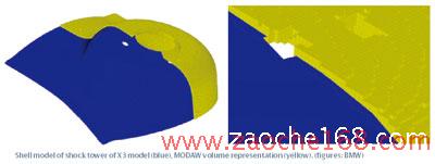 圖2 BMW X3減振器支座外殼模型(藍(lán)色),MODAW部分描繪圖(黃色)
